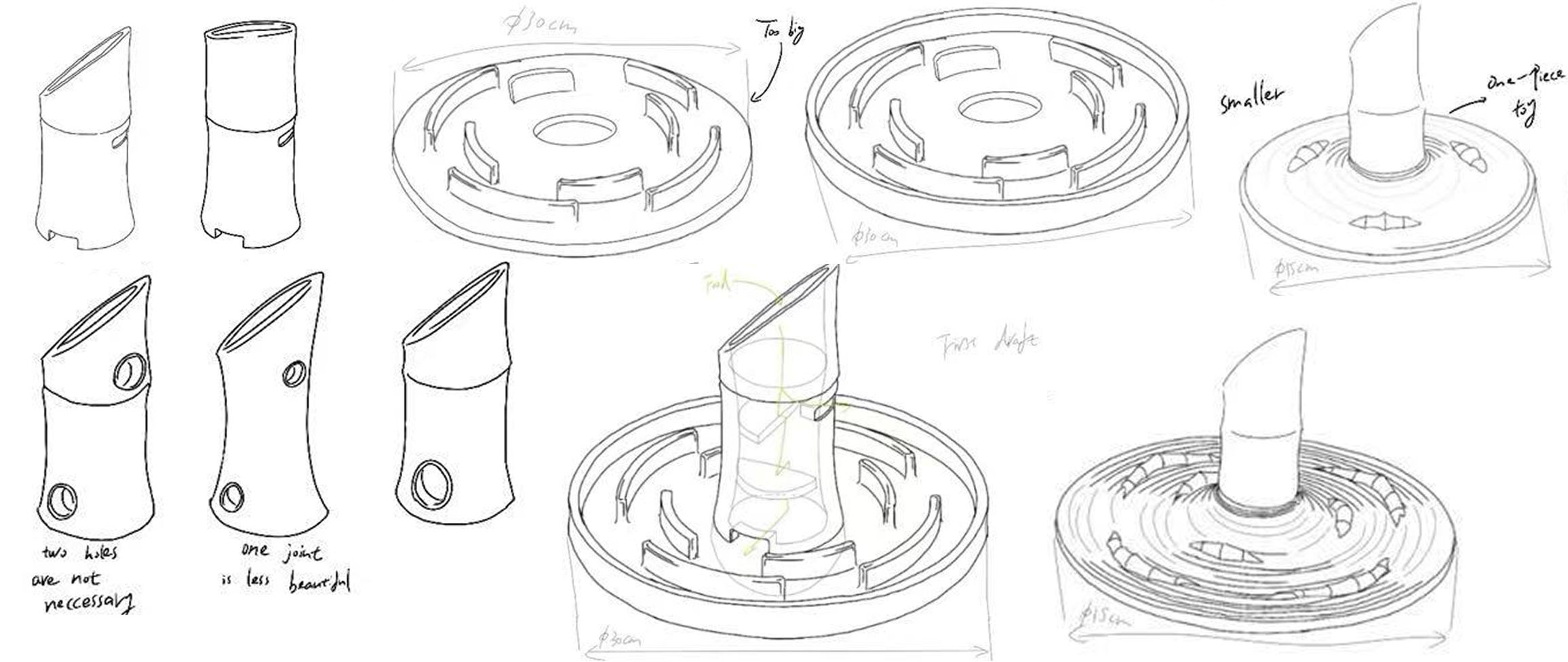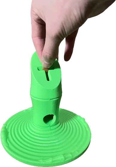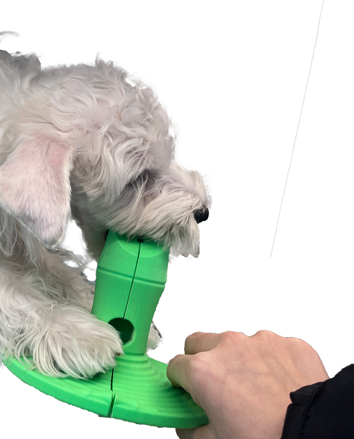 The prototype is easy for dogs to hold down with their paws, the bamboo length is well-suited for chewing, and owners can safely retrieve the toy from a dog’s mouth; however, the food opening initially required precise sizing, so the final model was refined with a larger center and narrower sides to accommodate different sizes of dog food.