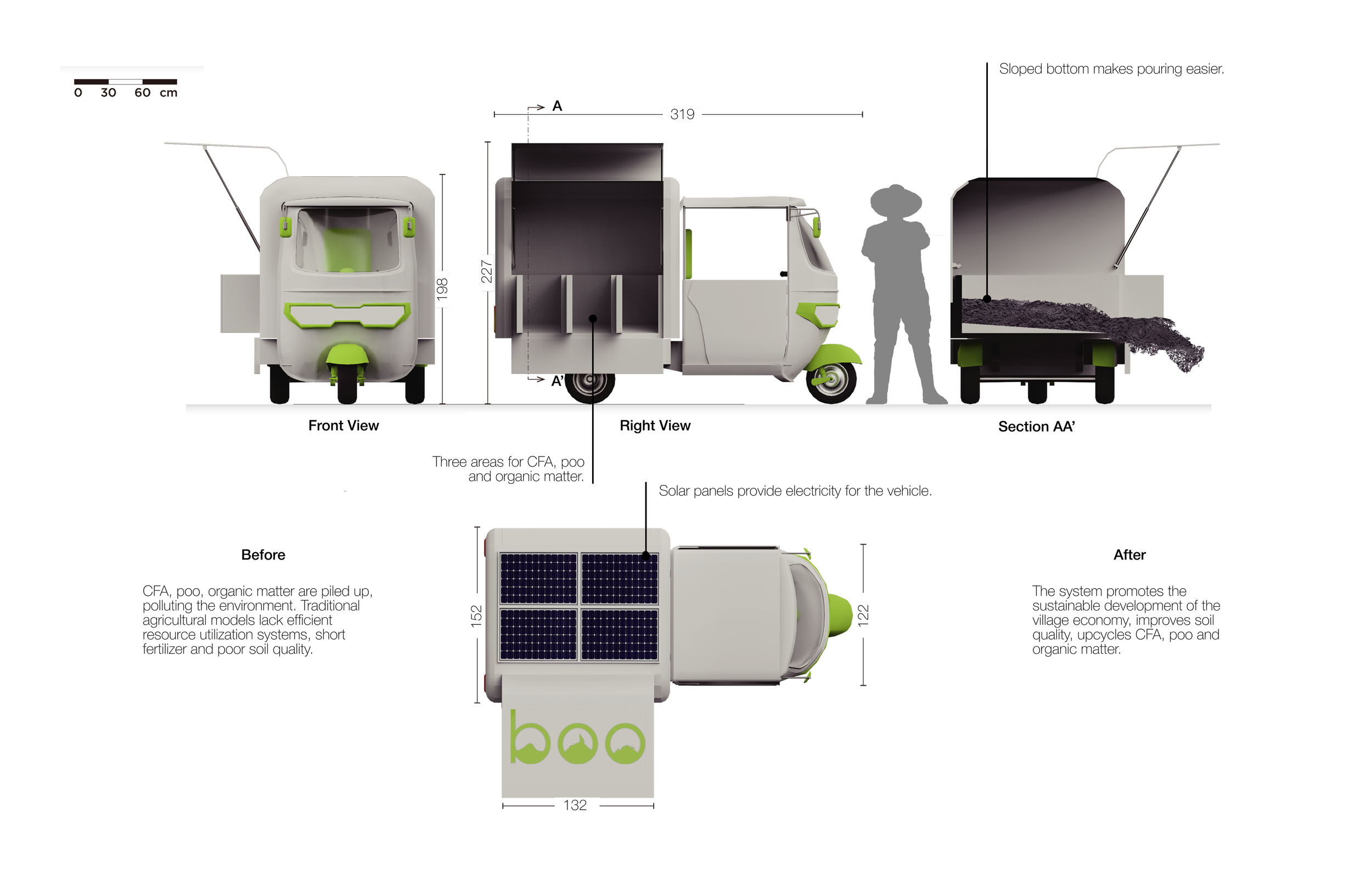 In this service system, villagers voluntarily collect coal fly ash (CFA), animal manure, and organic waste from their daily lives and hand them over to “Booboo” staff during regular village collection rounds. The staff use small carts to sort and transport the waste to a dedicated garden area—separated to prevent villagers from accidentally harvesting and consuming bamboo shoots—where bamboo is cultivated.