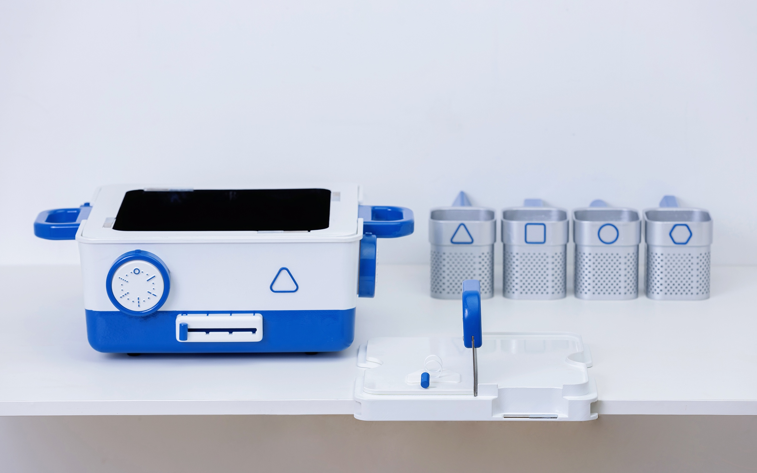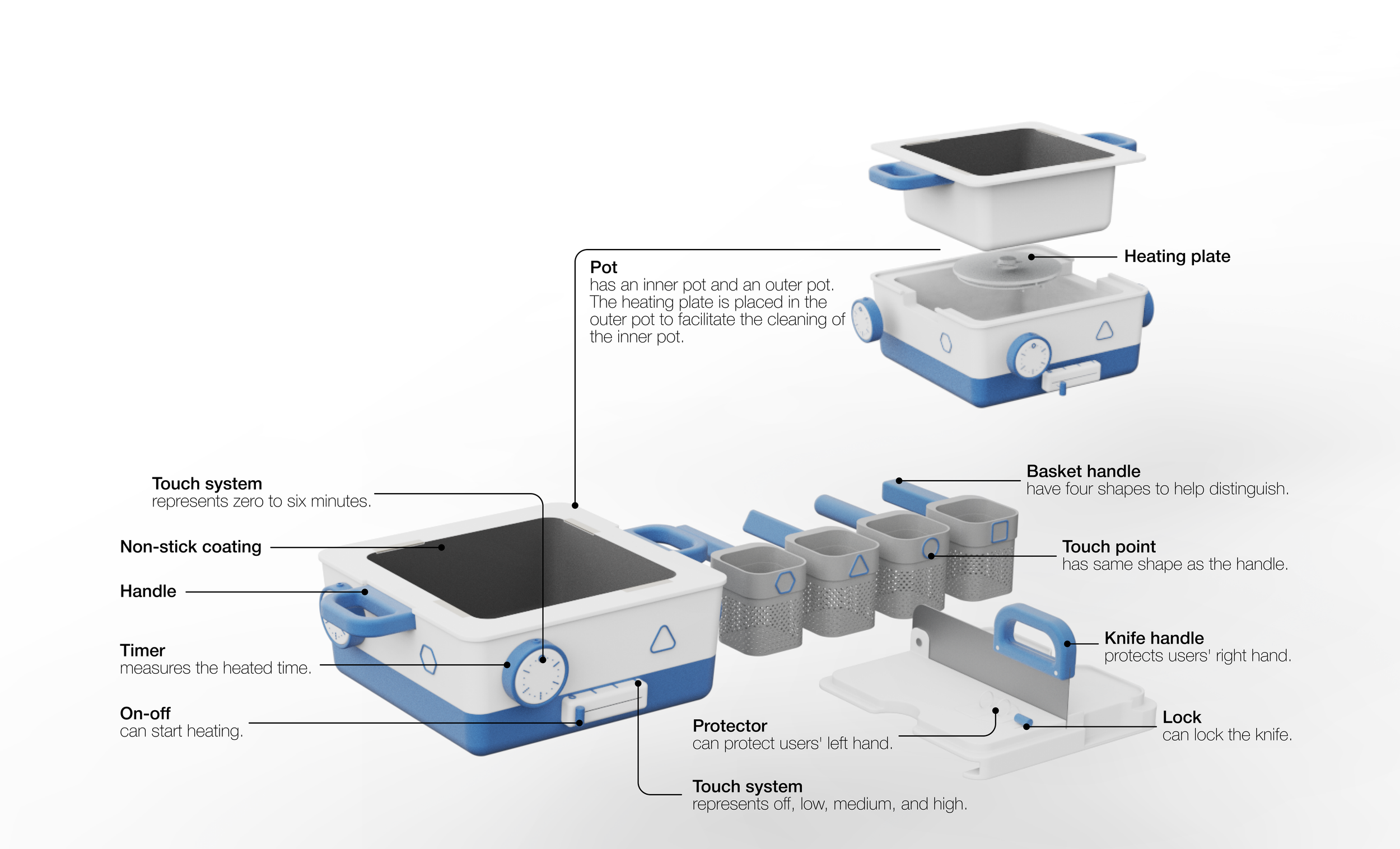 Toco includes an entire product line aimed at making cooking safer and more enjoyable for people with visual impairments. Included in the set are a hotpot, a cutting board, and four baskets, which are all connected through common touch points and magnets.